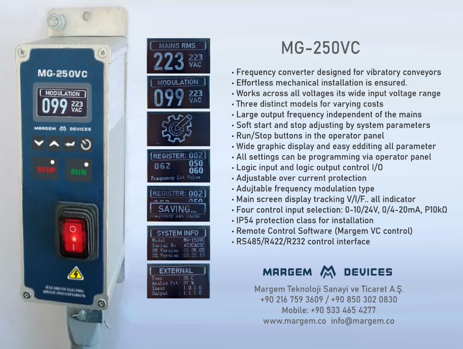 The MG-xxVICON is Vibration Control device for vibratory conveyor. Frequency inverter for vibratory conveyors, Wide input voltage range for worldwide use without changes,Smooth and quiet conveyor operation and reduced noise generation Control and operation via display and buttons. Start/RUN buttons for the conveyor in the operator display. RS485 interface. Easy to install.